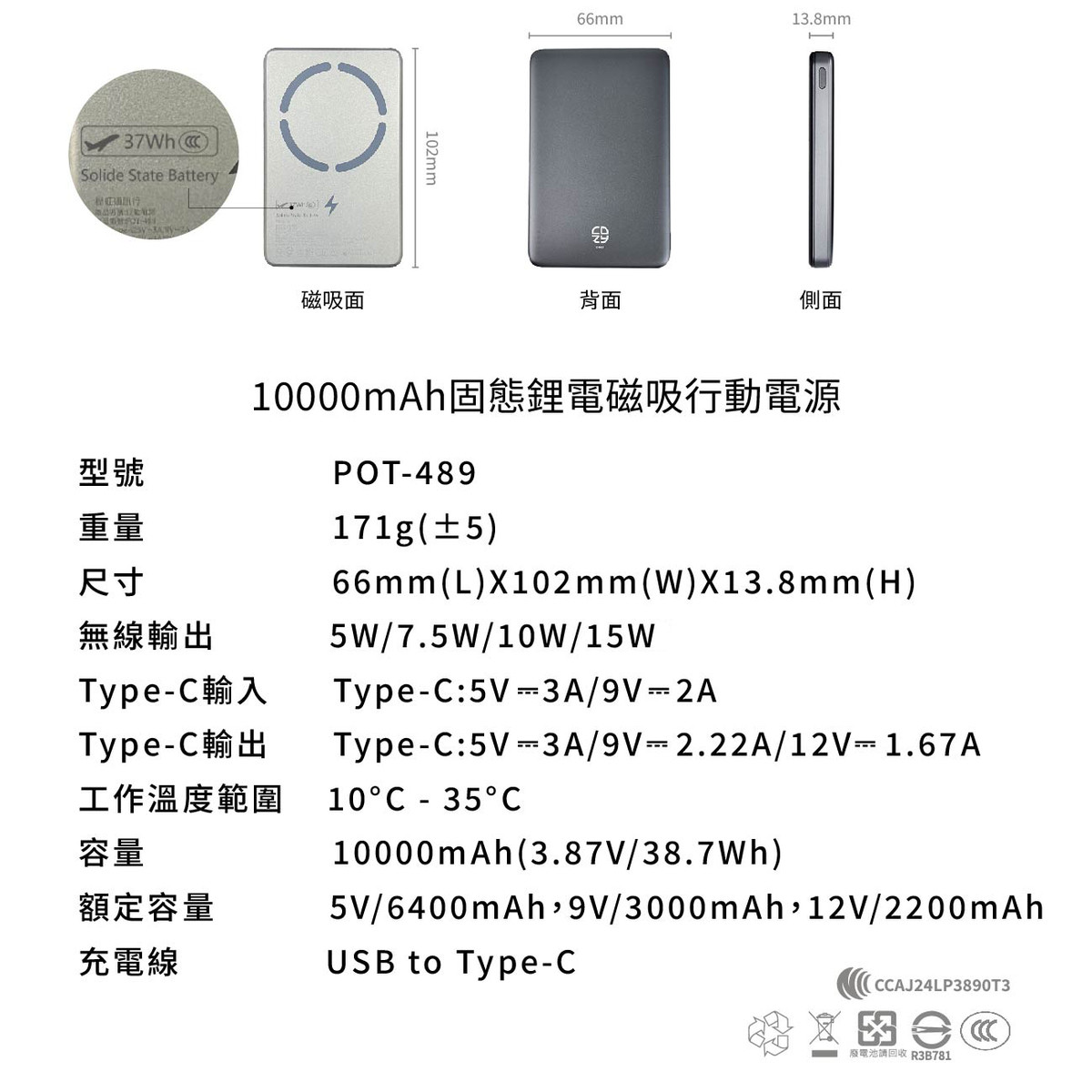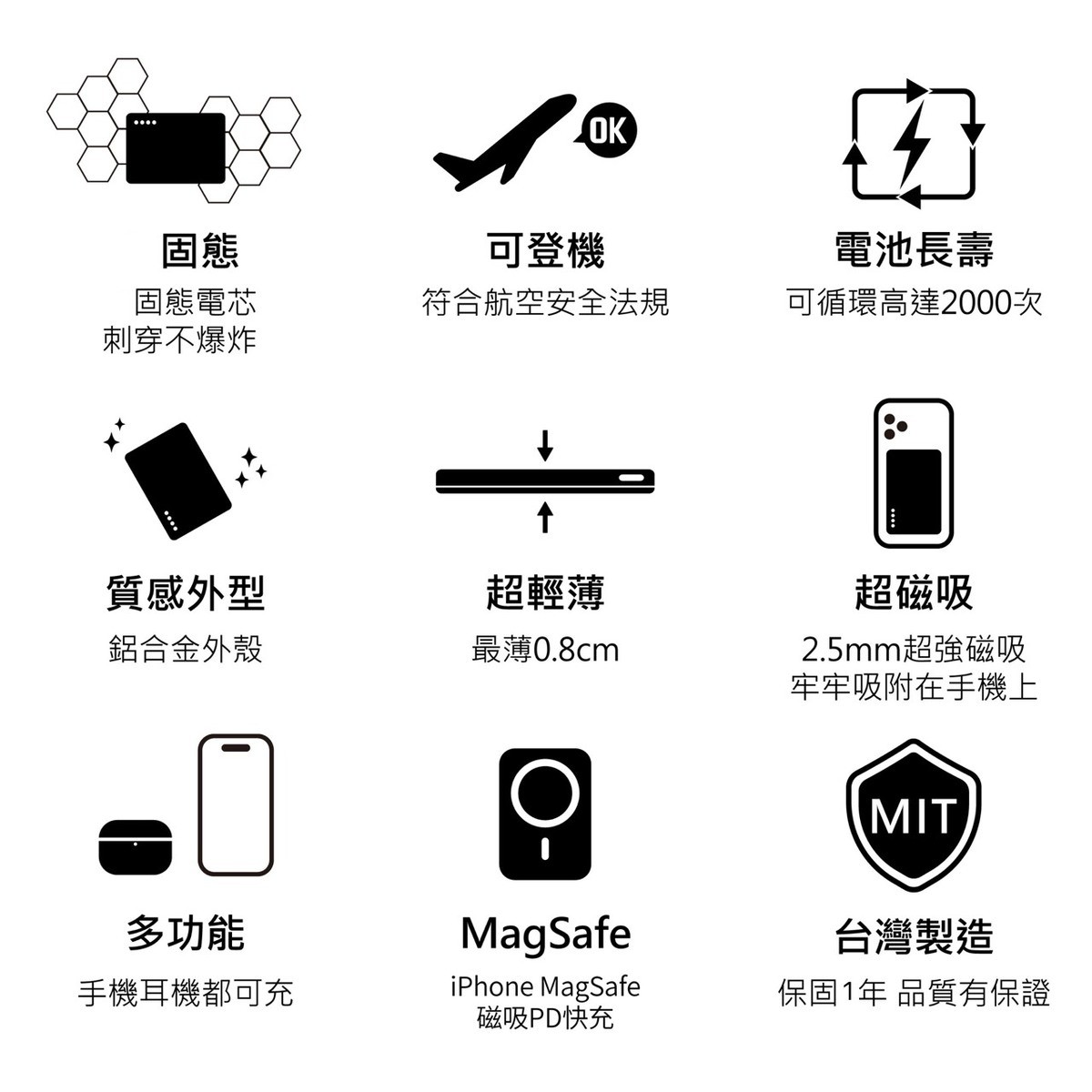 💦固態鋰電不爆炸、不燃燒、不膨脹 ✨電池壽命提高 循環次數提升2000次 🤗極致輕薄 不需額外帶線 輕鬆出門 📏一貼即充 20W快充 時尚金屬質感 🔶可變身無線磁吸車架 ✔️精準磁吸,不卡手機殼,實測iPhone和三星的犀牛盾、惡魔盾手機殼皆不卡鏡頭 😉有BSMI認證、NCC認證,外加投保5000萬產品責任險