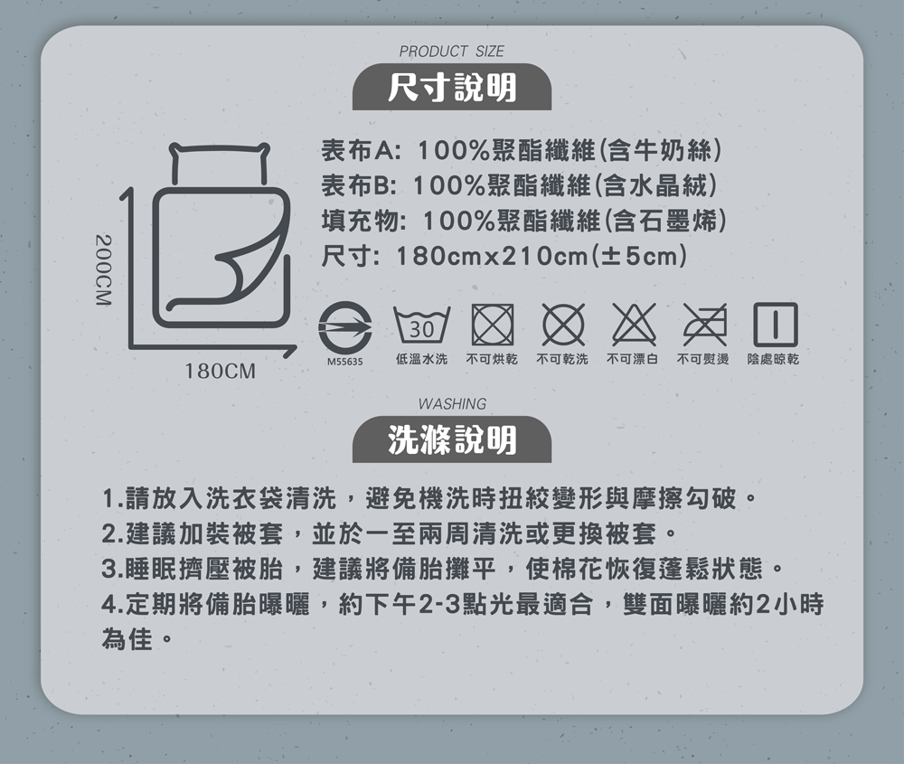 ⭐️【團購限定】送品牌專屬收納袋! ✔️添加石墨稀快速導熱 ✔️保暖蓄熱效果高 ✔️添加長效銀離子抗菌 ✔️高效抗靜電 ▻表布材質: 100%聚酯纖維(含銀離子抗菌劑) ▻填充物: 100%聚酯纖維(含石墨烯) ▻尺寸: 雙人180*210cm(6*7尺)(正負5cm)