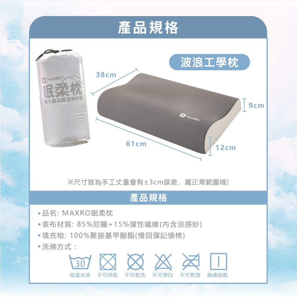 🛒內容物包含 : MAXRO眠柔枕 x1顆 ✓ 涼感親膚表布 清涼透氣 ✓ 可拆洗枕套 清潔so easy ✓ 一體成型 高密度回彈記憶棉 ✓ « 波浪工學枕 » 3點式承托 表布材質: 85%尼龍+15%萊賽爾( 內含涼感紗 ) 填充物:100%聚氨酯( 慢回彈記憶棉 )